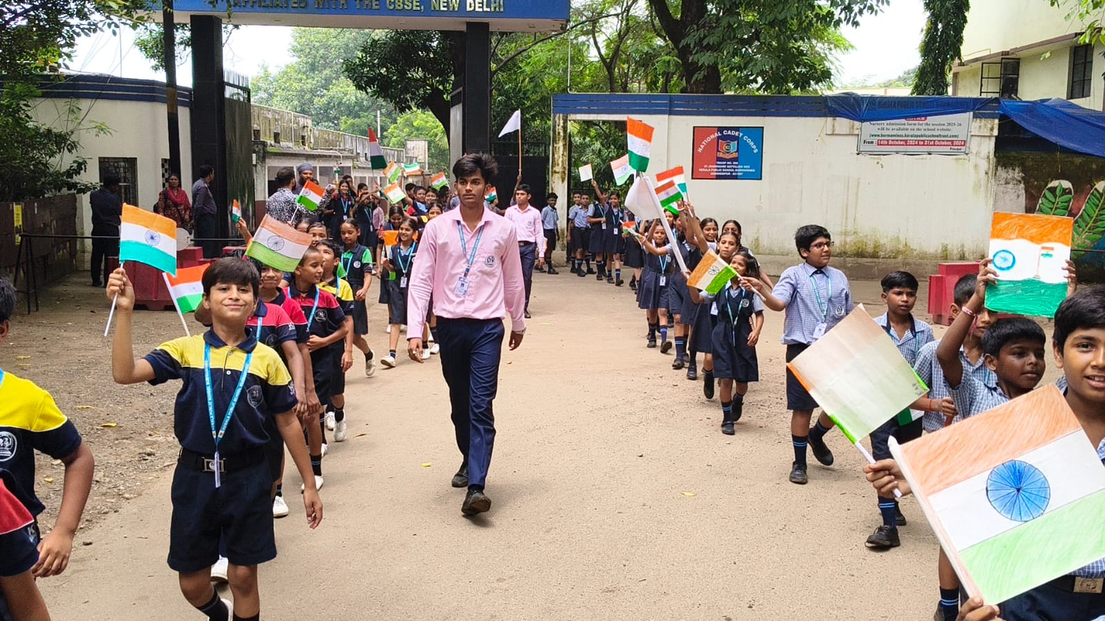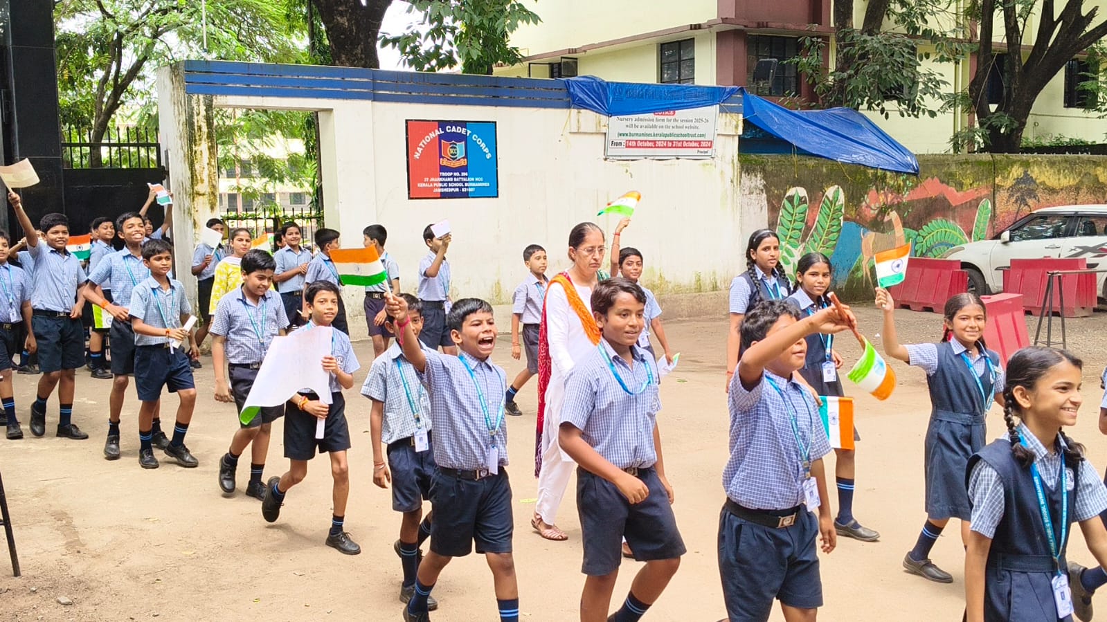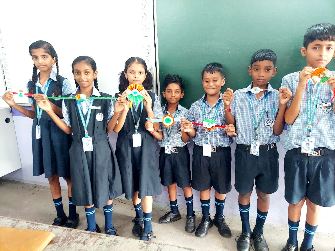 Students enthusiastically participated in bulletin board presentations, Tiranga making/drawing for Nursery to UKG, Flag Making Competition for Std. I to V, Tiranga Rakhi Making Competition for Std. III to VIII, Letter Writing Competition in English and Hindi for Std. VI to XII, and Tiranga Rangoli Making Competition for Std. IX to XII.