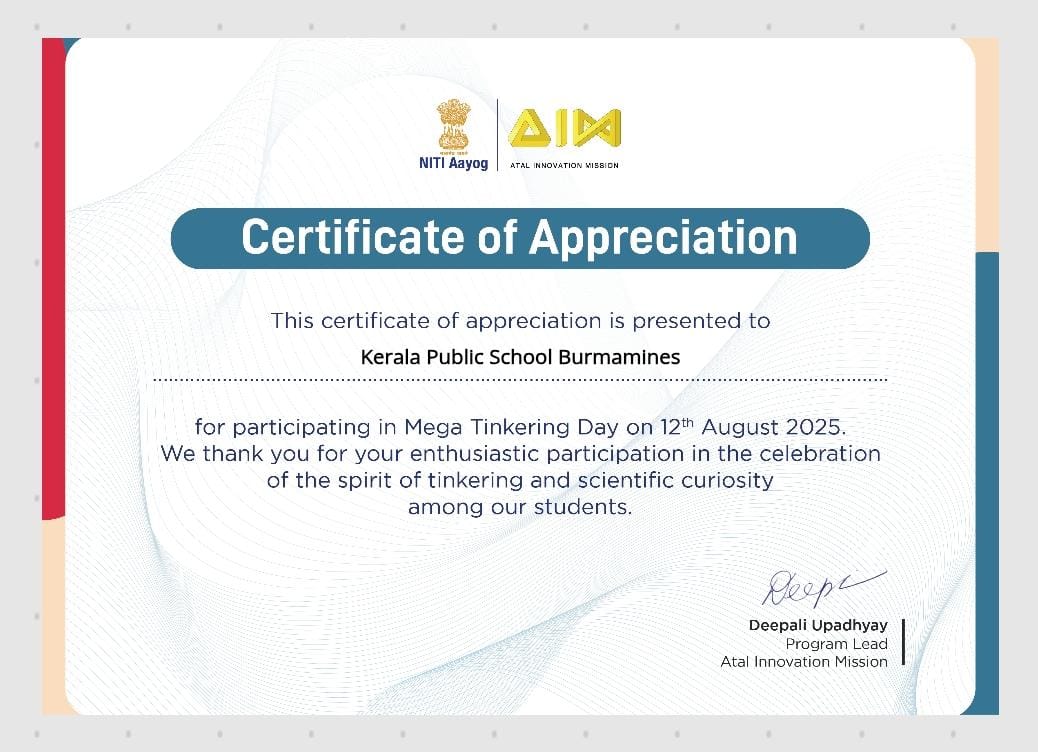 Date - 12.08.25 Event - ATAL Tinkering Day Kerala Public School, Burmamines celebrated ATAL Tinkering Day with great enthusiasm and innovation. As part of the celebration, a live workshop conducted by CBSE was organized in which four enthusiastic student groups participated. During the session, the students gained hands-on experience by designing and preparing vacuum cleaners, showcasing their creativity, problem-solving skills, and innovative thinking. The activity not only enhanced their practical knowledge but also nurtured a spirit of teamwork and curiosity. The celebration truly reflected the vision of Atal Tinkering Labs (ATL) – to ignite young minds, encourage scientific temperament, and foster a culture of creativity and innovation among students.