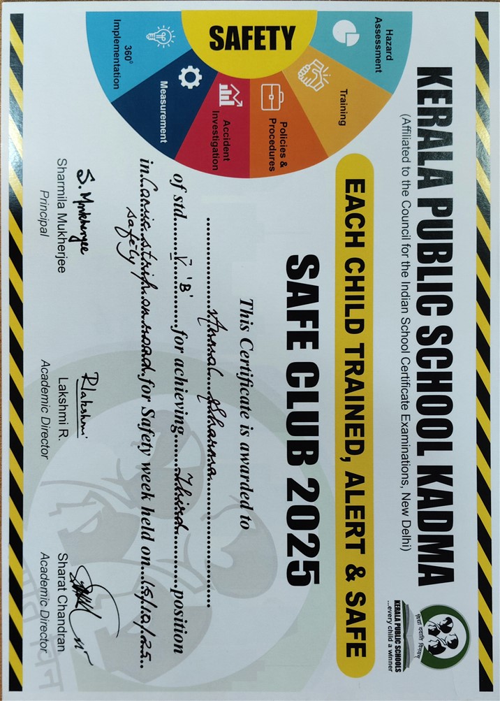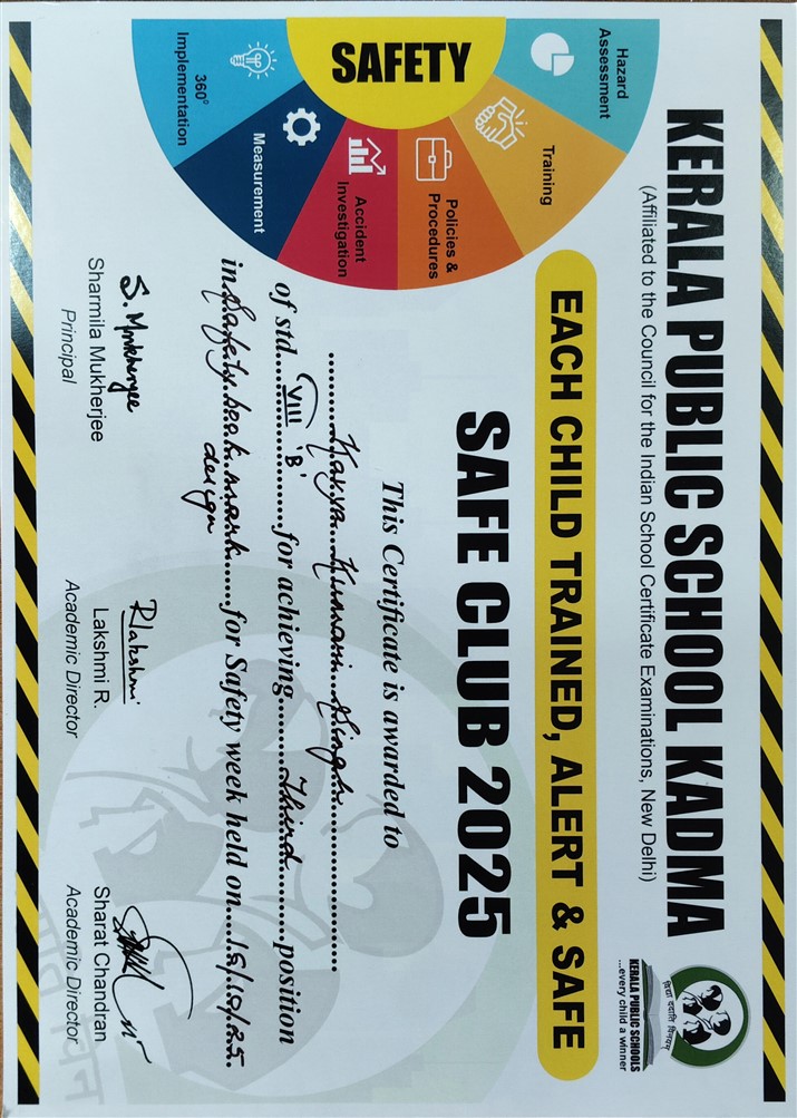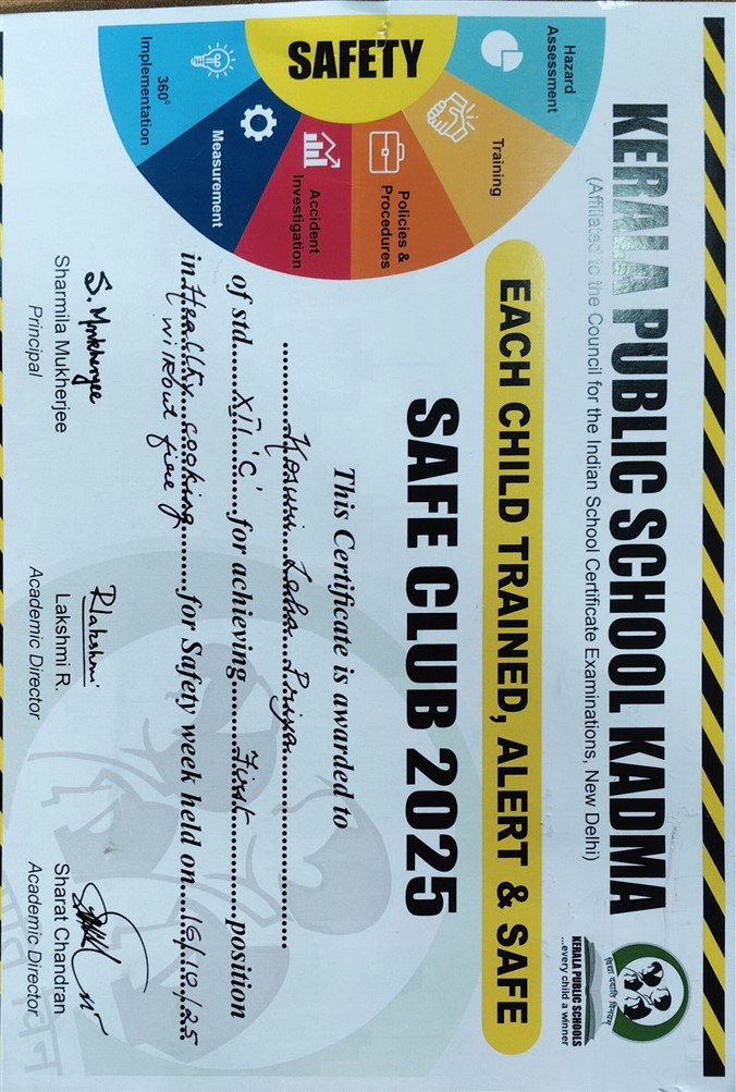 erala Public School, Burmamines proudly celebrates the commendable achievements of its students at the Inter-KPS Safety Week 2025–26 held at Kerala Public School, Kadma. Our young achievers demonstrated awareness, creativity, and responsibility through their outstanding performances: ???? Comic Strip on Road Safety – Anmol Sharma (Std. V B) secured 3rd Position Tr. Incharge: Aditya Sir ???? Safety Bookmark Competition – Kavya Kumari Singh (Std. VIII B) secured 3rd Position Tr. Incharge: Tr. Priyanka Dey ???? Healthy Cooking Without Fire – K. Leha Priya (Std. XII C) secured 1st Position Tr. Incharge: Tr. Sanghamitra Datta These achievements reflect our school’s commitment to promoting safety awareness, creativity, and life skills among students. ???? Heartiest congratulations to our winners and dedicated teachers for bringing laurels to Kerala Public School, Burmamines!