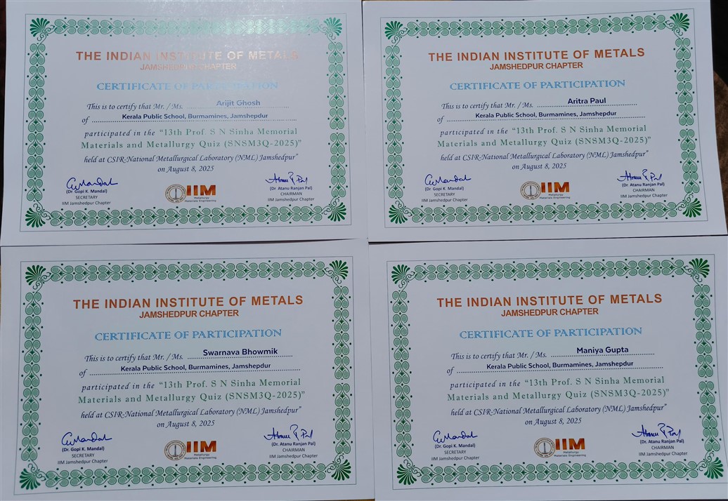 Kerala Public School, Burmamines actively participated in the 13th Prof. S.N. Sinha Metallurgy Quiz held at CSIR–NML, showcasing the enthusiasm and scientific curiosity of our senior students. The event provided an excellent platform for them to enhance their knowledge in the field of materials science and metallurgy while interacting with peers from various schools. Representing the school were two dedicated teams: Maniya Gupta (XII A) & Aritra Paul (XII A), and Swarnava Bhowmik (XI A) & Arijit Ghosh (XI A). Both teams demonstrated commendable effort, keen interest, and competitive spirit throughout the quiz. The school appreciates the hard work and active participation of all four students, who embraced this learning opportunity with great enthusiasm. Their involvement reflects the school’s commitment to encouraging academic excellence, scientific temperament, and exposure beyond the classroom.