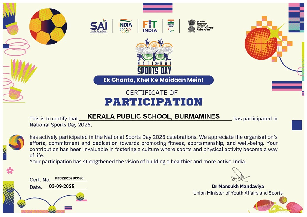 Kerala Public School, Burmamines enthusiastically celebrated National Sports Day to honour the legendary hockey player Major Dhyan Chand. The day began with a special morning assembly, where Mr. Rakesh Kumar delivered an inspiring address highlighting Major Dhyan Chand’s dedication, discipline, and invaluable contribution to Indian sports. His words motivated students to embrace sportsmanship and physical fitness as an integral part of their lives.